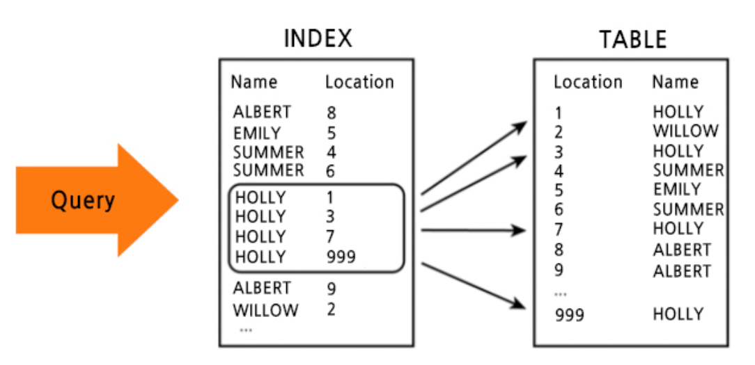 - 인덱스를 통해 Name을 먼저 조회하고, Name의 Location 값을 통해 테이블의 값을 조회한다.