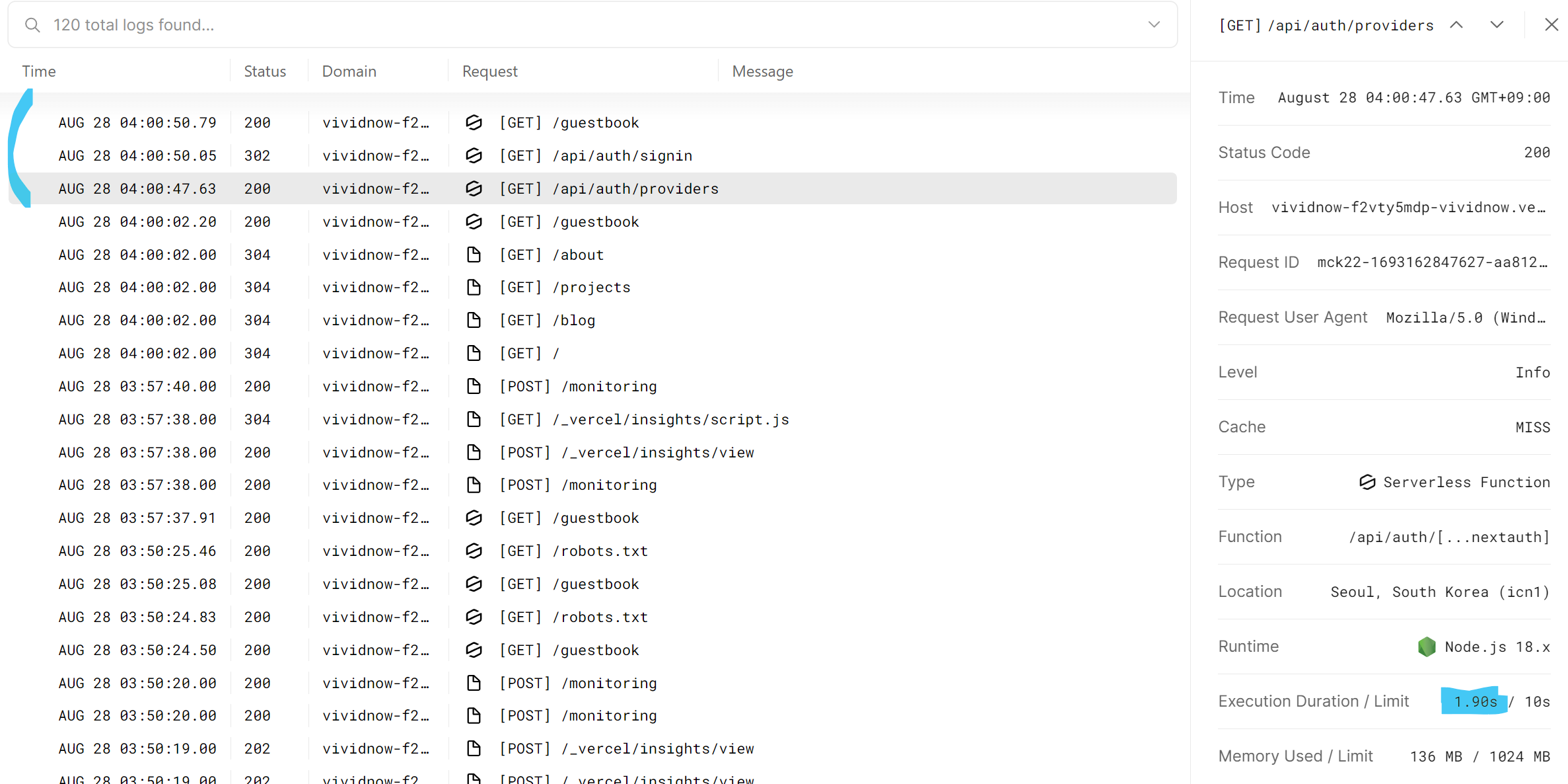 자, 얼마나 늦고 있는지 기존에 Vercel에서 서버리스 함수로 동작한 기록도 살 필 수 있다.