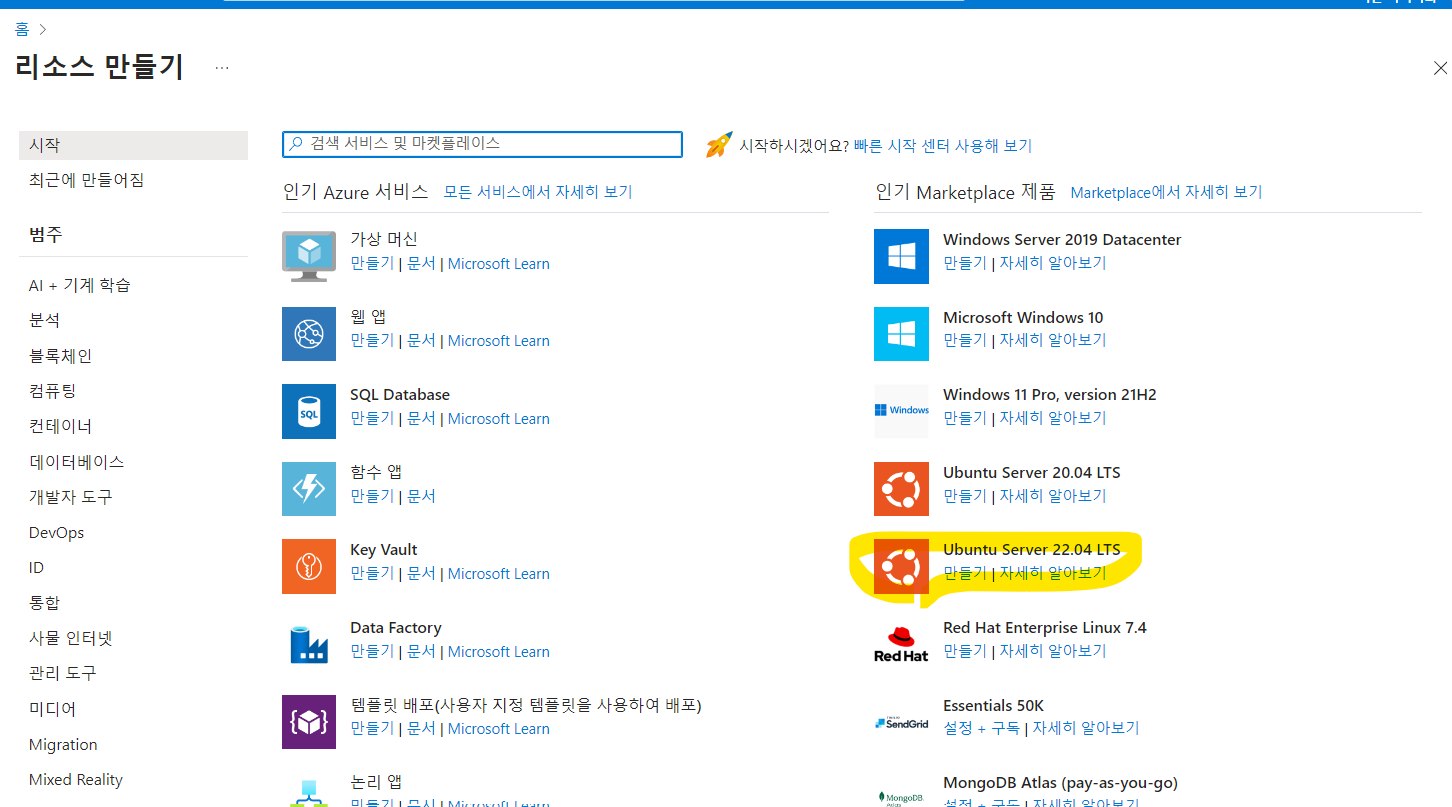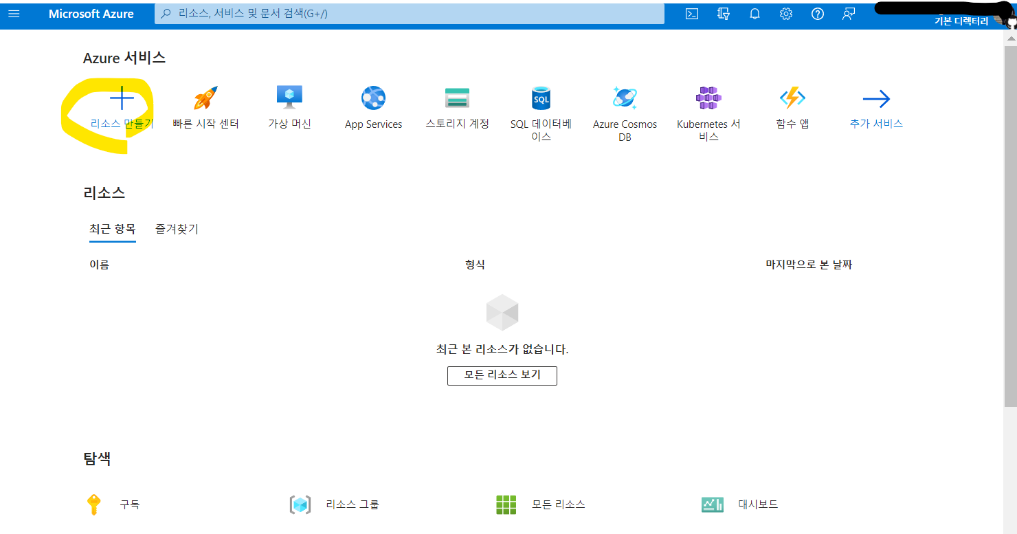 Azure의 홈으로 가시면 리소스 만들기 버튼이 있습니다.