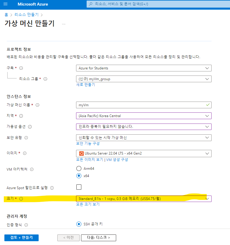 어떤 가상 머신을 만들지 옵션 선택이 필요로 합니다. Azure에서 어떤 컴퓨터를 빌릴지 고르는 과정이라고 보시면 됩니다.