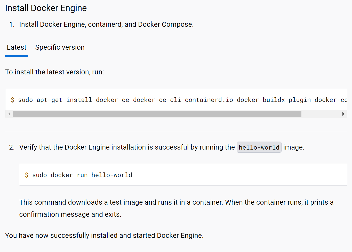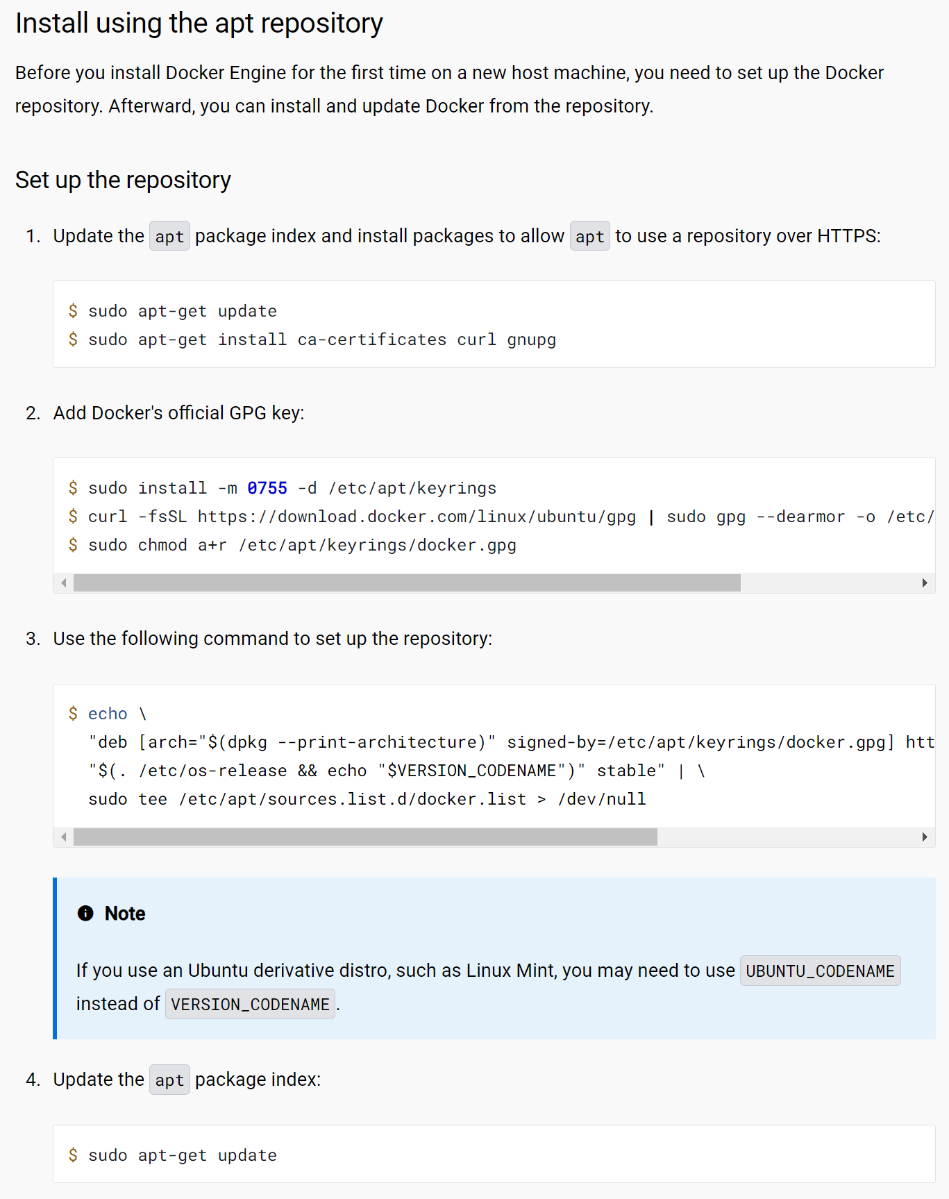 위 링크에 접속해서, 안내에 따라 도커 설치를 위한 명령어 순차적으로 입력합니다.