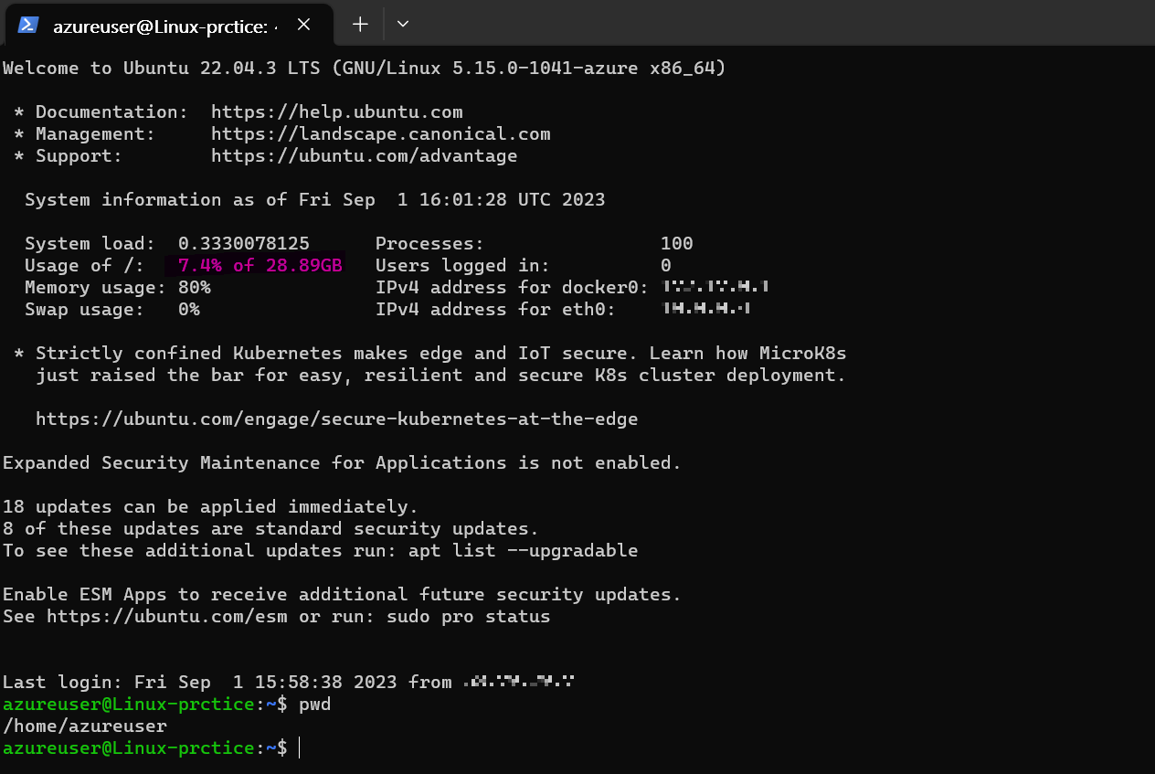 이제 로컬 환경 Windows의 Terminal을 열어서 SSH를 통해 생성한 가상 머신과 잘 연결했습니다.