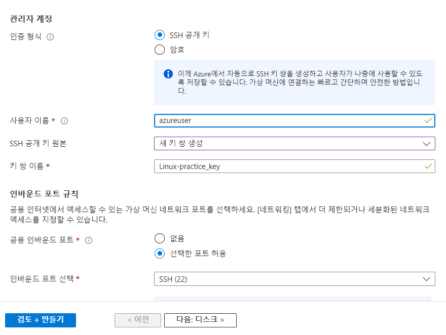 후술하겠지만, 가상머신과 연결할 때 SSH 공개 키 방식으로 연결할 것입니다.