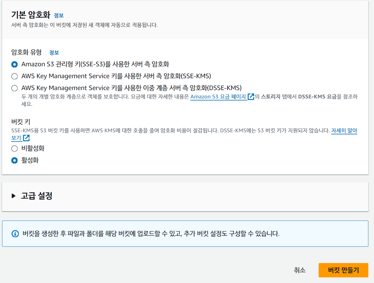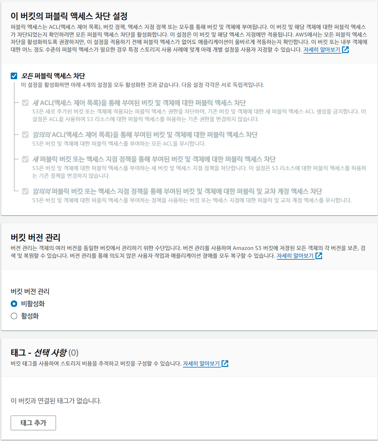 '이 버킷의 퍼블릭 액세스 차단' 설정은 중요한데,
