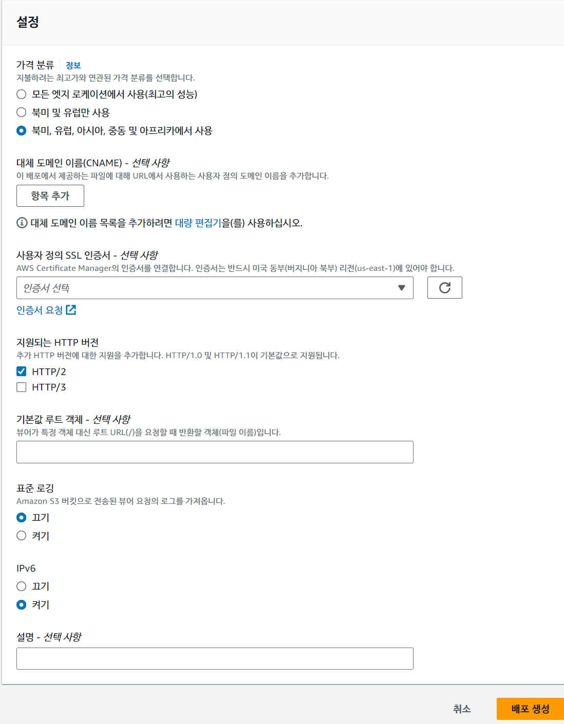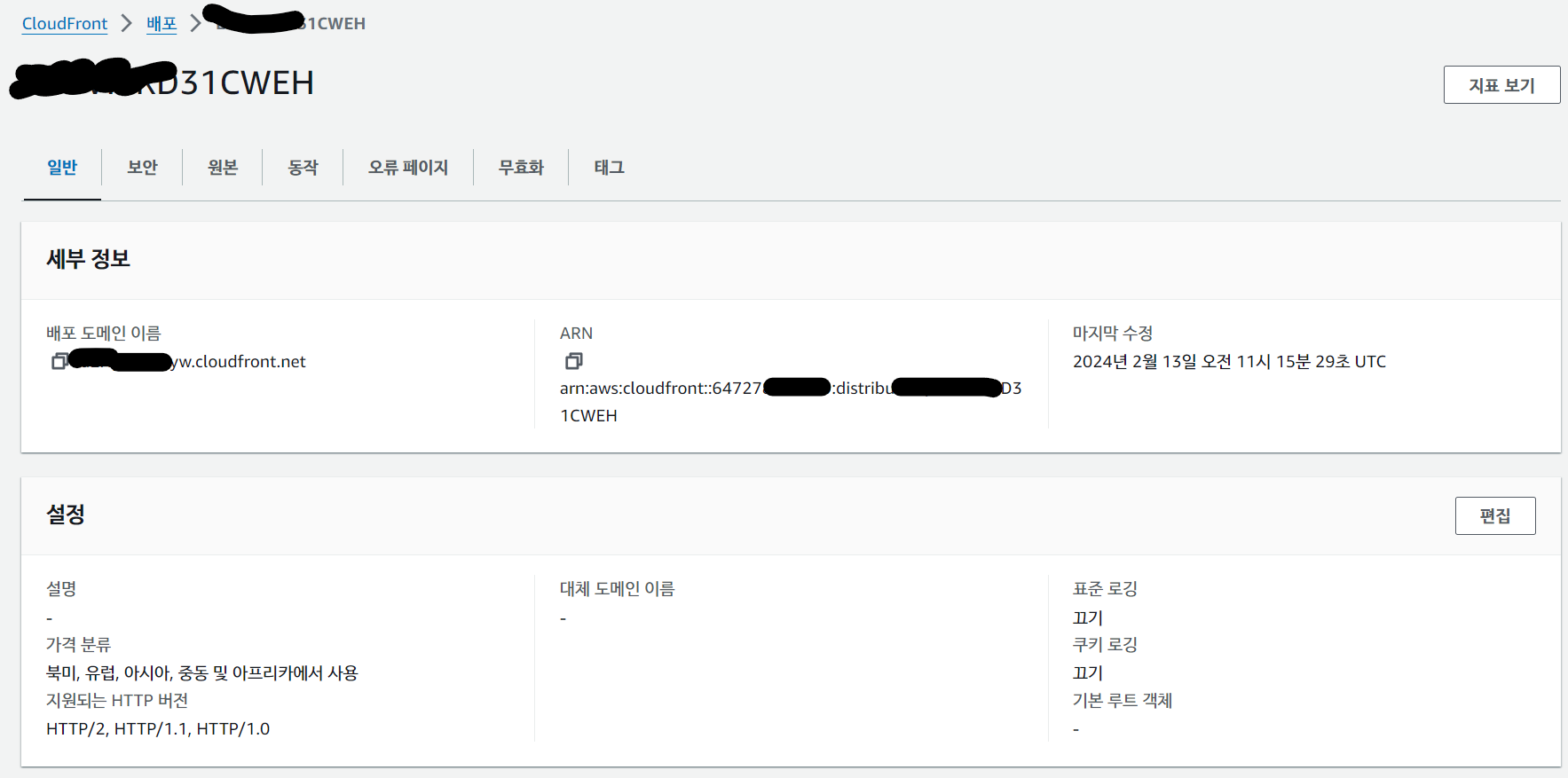 이제, 배포 생성을 하면 CloudFront 의 '배포 도메인 이름'을 획득할 수 있다.