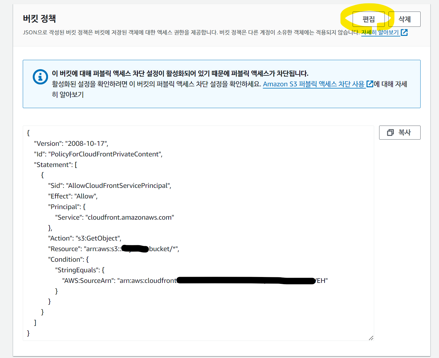 버킷 정책에서 '편집'을 통해서 복사한 '정책'을 붙여넣기 한다.