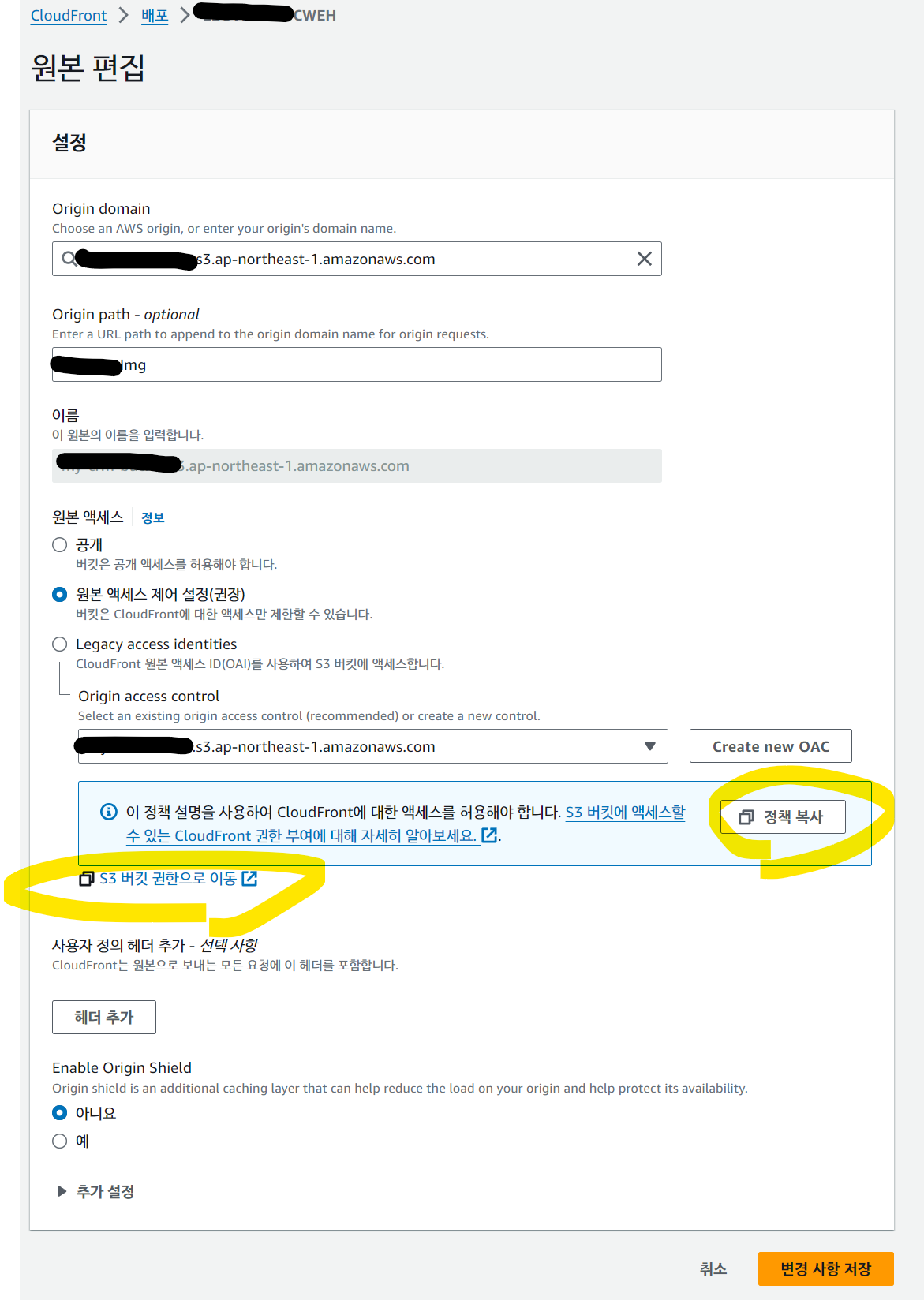 CloudFront에 대한 액세스만 설정할 것이므로 '원본 액세스 제어 설정(권장)'을 선택한다.