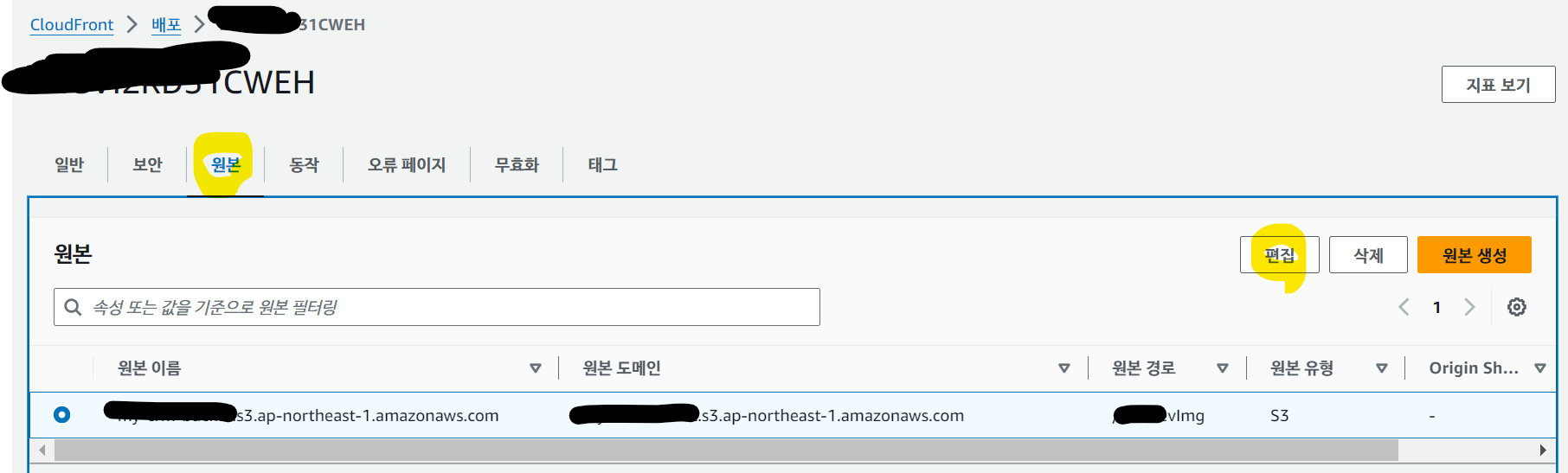 S3 생성 후 부여된 해당 원본 도메인을 선택