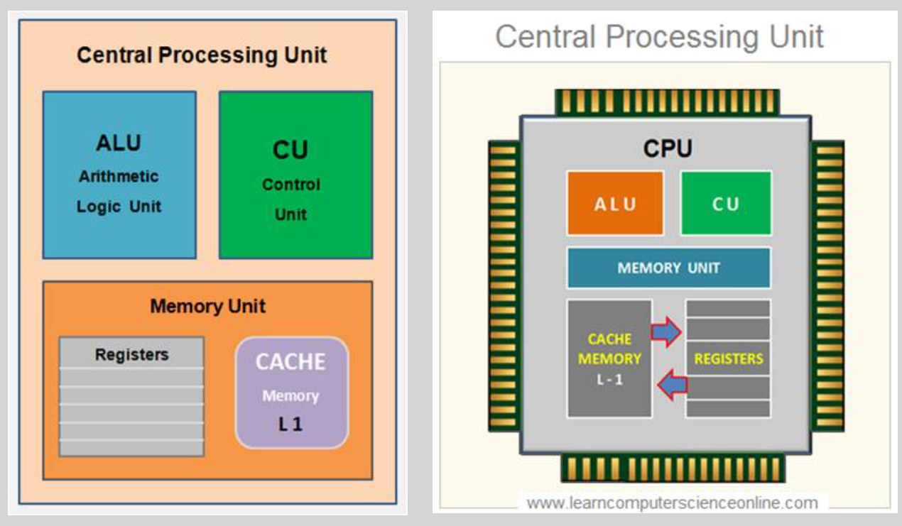 ALU(산술/논리 연산 유닛), CU(제어 장치), 여러 레지스터, 캐시로 구성되어있다.