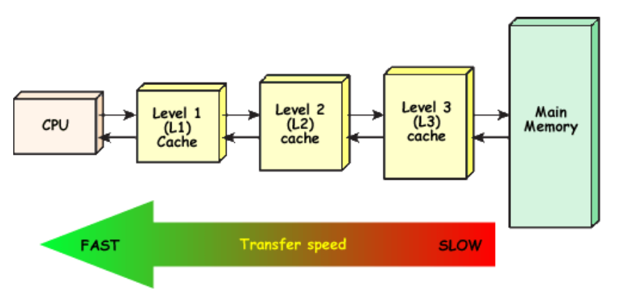 3단계 캐시 : 캐시메모리는 L1, L2, L3 까지 단계를 나눈다. CPU는 L1캐시에 가장 먼저 접근한다. 하지만 용량은 작다. 속도는 L1, L2, L3 순으로 빠르다. 반면에 용량은 L3, L2, L1 순으로 많다.