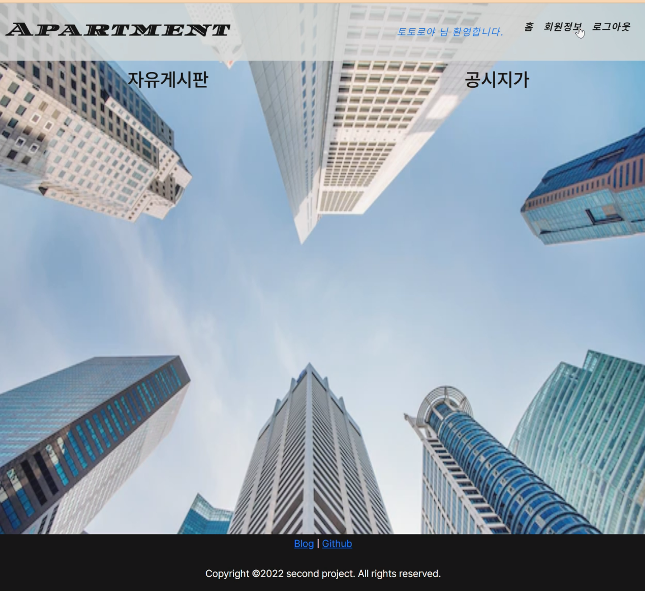 프로젝트 이름 : 아파트 커뮤니티구현한 기능 : 회원가입 , 로그인 , 로그아웃 , 회원정보 , 파일 업로드&다운로드 , 다른 홈페이지 조회 , 게시글 작성&수정&삭제 , 등이승준 : 이번이 두번째 지만