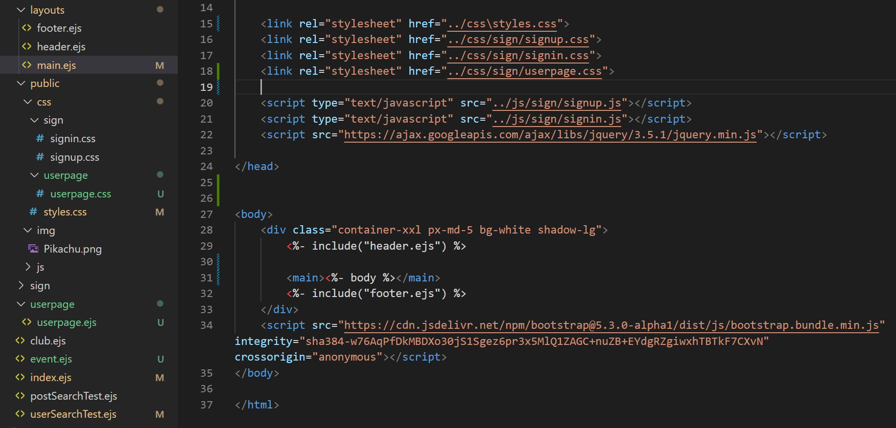 새로 생성한 유저페이지의 ejs 파일의 문제인가? 이런 생각을 하면서,