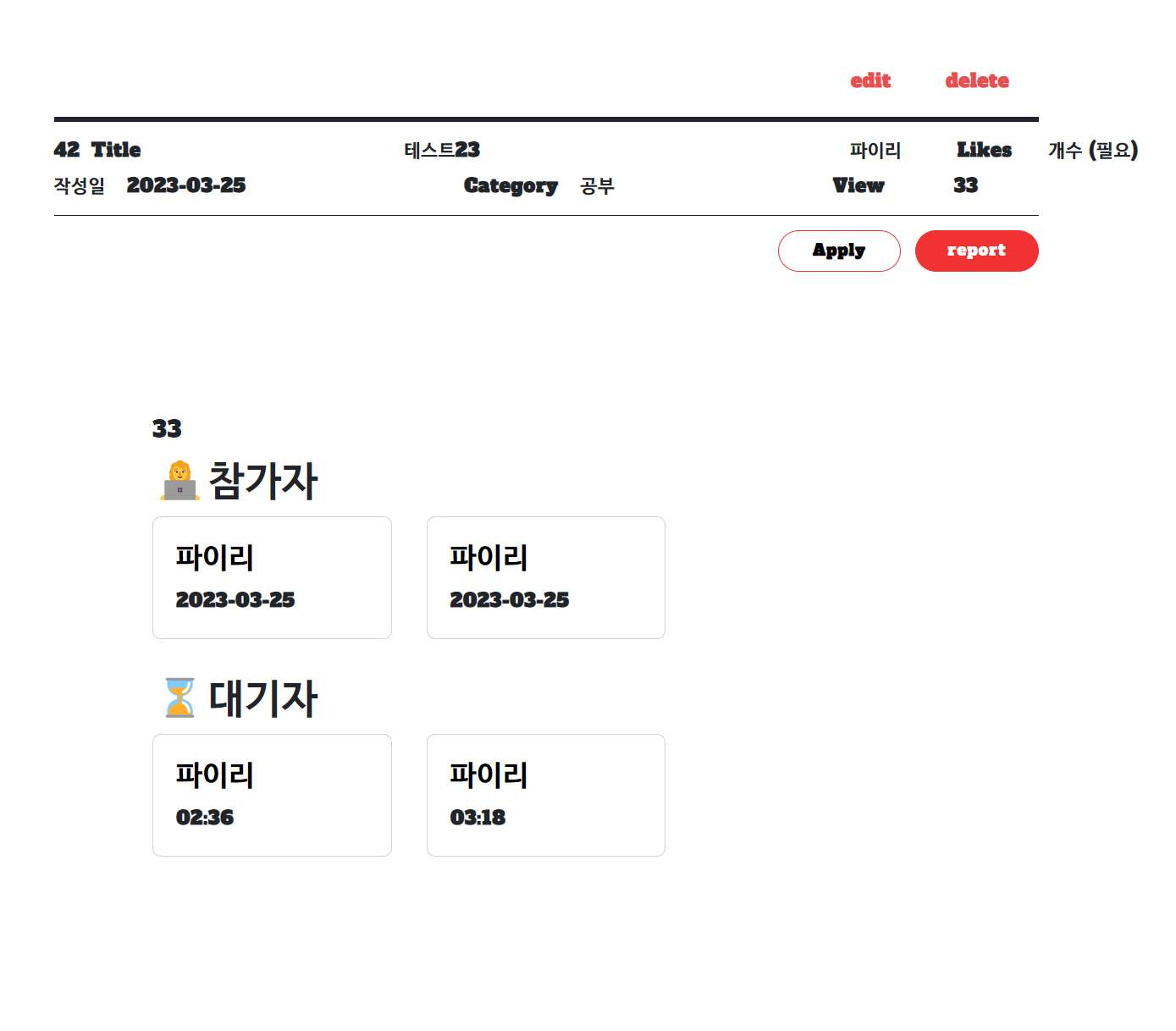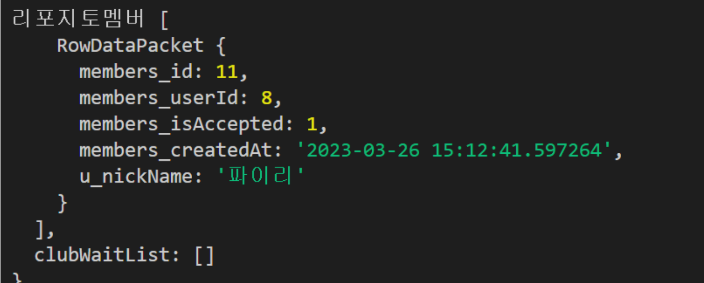위 사진처럼 33 이외에 모임의 참가자, 대기자 명단을 불러오는 작업을 하려 한 것이다.