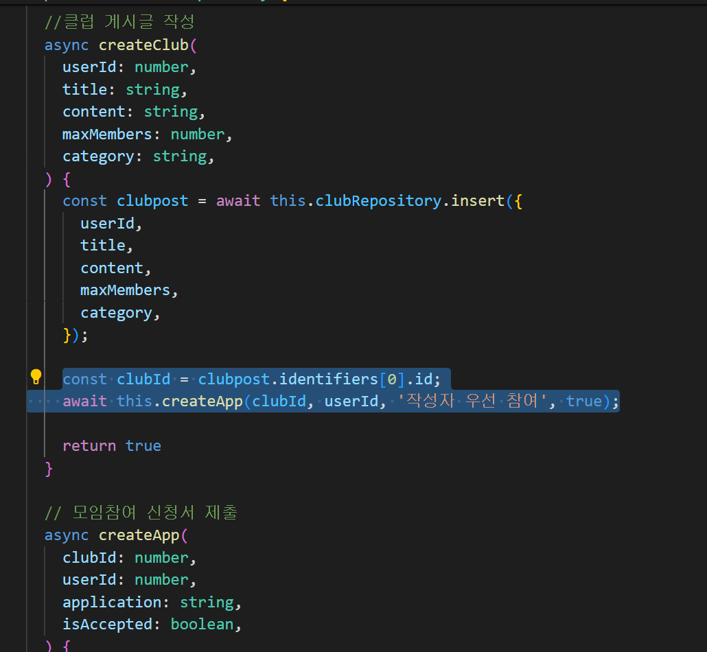 - 작성자가 게시글을 작성하자마자, 어떻게 멤버로 참여하게 만드냐라는 의문이 생긴다. 나는 그 방법은 두 개 함수 간의 관계를 Promise기반으로 적용해서 구현하면 된다고 생각했다. 다시 말해, 게시글 작성 함수+모임 신청 함수를 순차적으로 적용하면 된다. 게시글 작성 함수 실행이 완료될 때, 모임 신청함수를 위치시키는 것이다. 즉, 게시글 작성 함수 내에 모임 신청 함수를 포함시키면 된다. 물론 모임 신청과 함께, 참여 수락도 동시에 설정한다.