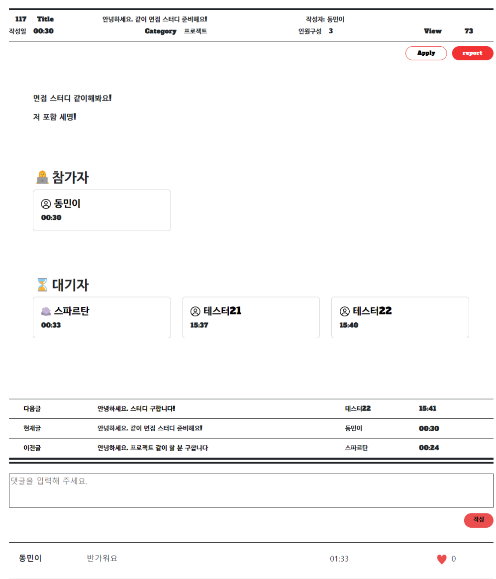 - 부트캠프 수료생 대상으로 스터디/포트폴리오/면접 스터디 등 모임을 매칭하는 게시판