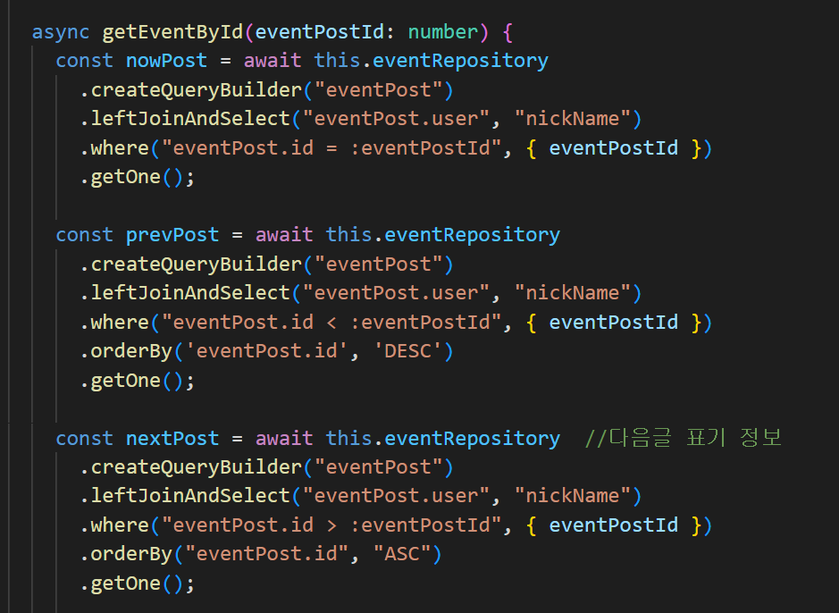 - 현재글의 상세 데이터를 가져오는 것은 가장 기본적인데, 다음글, 이전글 가져오려니, 어떻게 가져와야하나? 라는 질문에서 시작됐다. 결론은 조회하는 게시글 ID 보다 숫자가 적거나, 낮은 것을 찾으면 된다. TypeORM에서는 LessThan 혹은 MoreThan이라는 방식을 사용할 수 있다. createQueryBuilder를 사용하면 오른쪽과 같다.